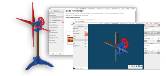 A standards-based, cloud-based virtual modeling STEM application that guides students through an engaging, realistic wind turbine development process capped by a very cool siting challenge and simulation. Then, students can construct their wind turbine blades, or output STL files to print their wind turbine blades on a 3D printer, and then assemble their wind turbines.
